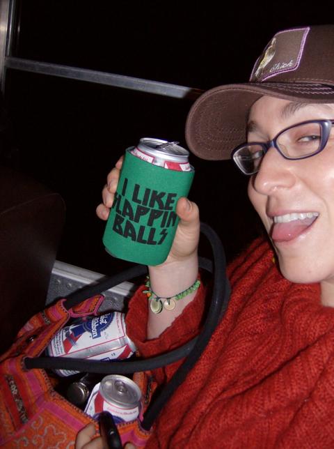 Here’s Molly with her awesome Workshop-supplied beer coozie and “spare ammo” in her giant purse/emergency parachute, on the way to the pinball museum. Unfortunately, she made a critical error in judgment by also grabbing a bottle of the re-themed Bum Wine known as Blast.