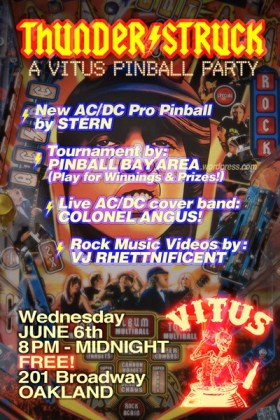 ACDC cover band Colonel Angus and Pinball Bay Area have teamed up for a night of music and pinball. Free entry. Novice Pinball tournament. $5 entry + Quarters for games. All $5 entries paid out to winners. Raffle prizes for all entrants and plaques to winners. Also enjoy playing the six pinballs, including Medieval Madness, Elvira Scared Stiff, Twilight Zone, Getaway, Theater of Magic and ACDC.
